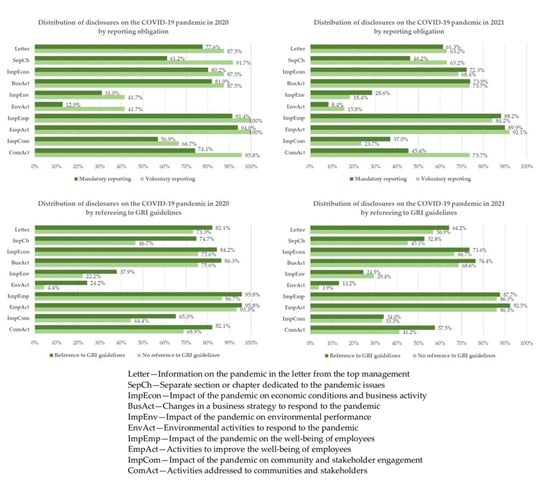 The relevant data disclosed by the companies in the analyzed areas was related to the number of reports obtained for 2020 and 2021. The analysis took into account the percentage share of disclosures related to the COVID-19 pandemic in individual reporting areas for each year of the analysis, and the distribution of disclosures related to the pandemic in the areas under consideration, taking into account: (1) sustainability impact group, (2) type of report, (3) obligation or lack of obligation to prepare a report presenting non-financial data, and (4) reference or lack of reference in the report to the GRI guidelines. Figure 3 presents the aggregated results of the performed analyses.