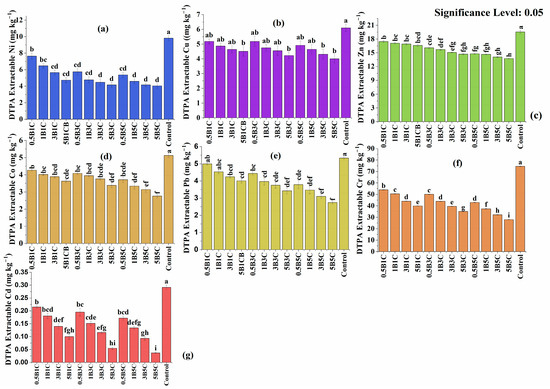 Concentrations of DTPA-extractable heavy metals in the pot-cultured soil with the application of seed balls having varying fractions of biochar composite and kaolinite: (a) variations in the DTPA-extractable concentrations of Ni; (b) DTPA-extractable Cu; (c) DTPA-extractable Zn; (d) DTPA-extractable Co; (e) DTPA-extractable Pb; (f) DTPA-extractable Pb; and (g) DTPA-extractable Cd. (Letters on the top of the bar graph represent significant mean difference).