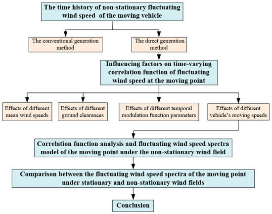 In this paper, the fluctuating wind speed spectra form of the moving point under the non-stationary wind field was taken as the center. Firstly, the direct generation method of fluctuating wind speed spectra from the moving point under the non-stationary wind field was proposed. Then, the effects of different mean wind speeds, ground clearances, temporal modulation function parameters, and vehicle’s moving speeds on the time-varying correlation function ratio of fluctuating wind speed at fixed and moving points were investigated based on the time-varying correlation function of non-stationary fluctuating wind speed at fixed points. Further, the fluctuating wind speed spectra form of the moving point under the non-stationary wind field was derived using the establishment of a relational expression of the time-varying correlation function of fluctuating wind speed at fixed and moving points. In addition, the relational expression of fluctuating wind speed spectra of the moving point under the stationary and non-stationary wind fields was established by comparing the spectra under the stationary wind field. Meanwhile, the fluctuating wind speed spectra model of the moving point under the non-stationary wind field was derived via various modulation function forms, which further verified the accuracy of the relational expression. Finally, some main conclusions were presented. The studied configuration in this paper is given in Figure 1.
