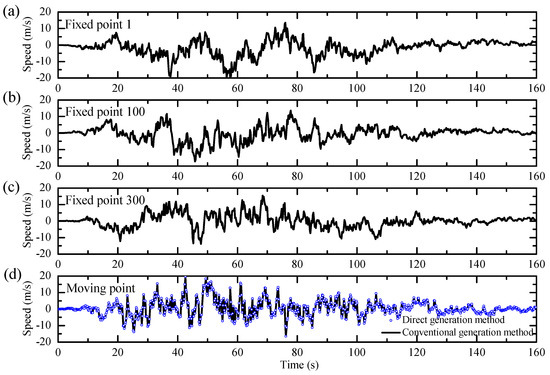 Time histories of fluctuating wind speed at the fixed and moving points. (a) Fixed point 1; (b) Fixed point 100; (c) Fixed point 300; (d) Moving point.