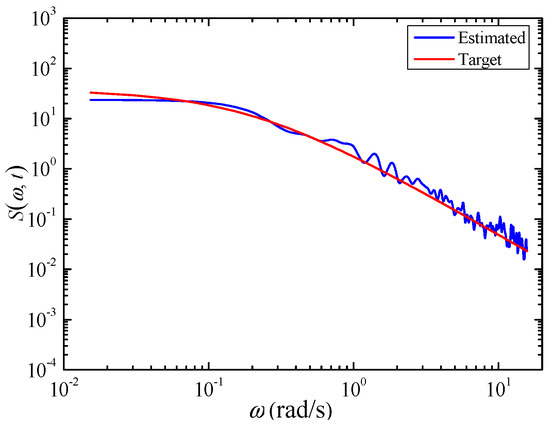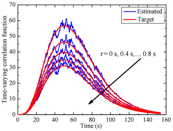 The simulation of a non-stationary random process is conducted according to Priestley’s EPSD and Shiotani’s coherence function models. According to a research background that the high-speed train passes over a bridge under the thunderstorm downburst wind field, the parameters are taken as follows: ground clearance Z = 20 m, incoming mean wind speed U = 30 m/s, surface roughness height Z0 = 0.01 m, sampling time Δt = 0.2 s, dividing number of frequency N = 1024, upper cut-off frequency ωu = 5π, dividing number of time Nt = 2048, space interval Δy = 8 m, the number of simulated fixed points M = 800, and time of duration is 160 s. The non-stationary fluctuating wind speed time–histories at fixed points are obtained by Equation (10), with the simulated time–history of the 1st, 100th, and 300th points shown in Figure 2a–c. In this paper, Ns = 2000 means that 2000 wind speed samples are generated to estimate the time-varying correlation function and EPSD, which can verify the accuracy of the non-stationary fluctuating wind speeds at fixed points. The estimated results and corresponding target values are shown in Figure 3 and Figure 4, respectively, which show that the correlation function and EPSD of the simulated time history of non-stationary fluctuating wind speed samples at fixed points are both in good agreement with corresponding target values, proving the excellent performance of this method in simulation of non-stationary wind speed time–histories at fixed points.