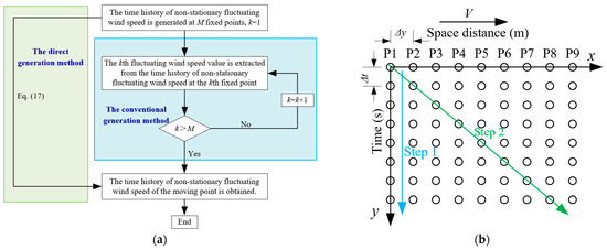 The simulation step of the conventional generation method and direct generation method. (a) Flow chart for simulation steps of conventional generation method and direct generation method. (b) The schematic diagram for generating the fluctuating wind speed time history of the moving vehicle.