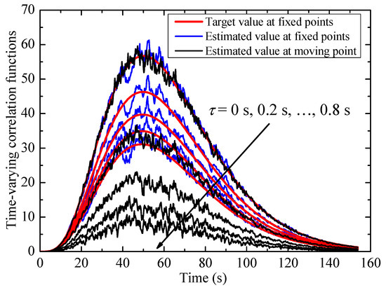 The correlation function represents the interdependence of two different times in a random process. The comparison between time-varying correlation functions of fluctuating wind speed at fixed and moving points is shown in Figure 6. It indicates that the two function curves coincide well at the time delay τ = 0 s, and the time-varying correlation function of fluctuating wind speed at the moving point is smaller than that at fixed points but with the same variation trend at the time delay τ > 0 s, which will be illustrated and verified in details below. According to Wiener–Khinchin formula and Equations (11) and (12), the transformation relationship between the time-varying correlation function and the EPSD function of the non-stationary random process can be given as follows [35]: