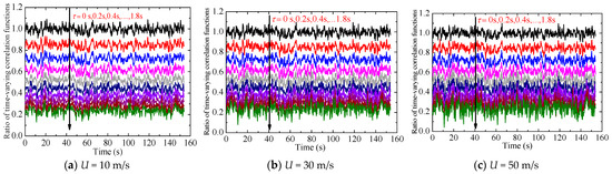 In order to compare the effects of different mean wind speeds on the time-varying correlation function of fluctuating wind speed at the moving point and enhance the contrast under different mean wind speeds, the time–histories of non-stationary fluctuating wind speed at the moving point under the mean wind speeds of 10 m/s, 30 m/s and 50 m/s are generated using the above direct generation method, while other parameters of non-stationary the time history of fluctuating wind speed at moving and fixed points are set as the same as those in Section 2.2. It should be pointed out that the incoming mean wind speeds used here do not mean actual values but for better comparison. The workstation computer equipped with Intel (R) Xeon(R) Gold 6226R CPU @ 2.9 GHz 2.89 GHz and 128 GB RAM is used for computing. Compared with the conventional generating method, the computational efficiency of the direct generation method is increased by 22.7% when generating the wind speed samples. The time-varying correlation functions of fluctuating wind speed at the moving point under different mean wind speeds in Figure 7 represent that the time-varying correlation function values of fluctuating wind speed at moving and fixed points are roughly consistent at the time delay τ = 0 s. When the time delay τ > 0 s, the time-varying correlation function values of fluctuating wind speed at the moving point are smaller than those at fixed points at each time. Meanwhile, the maximum values of the time-varying correlation function of fluctuating wind speed at moving and fixed points increase as the mean wind speed increases. Figure 8 provides the variation of time-varying correlation function ratio between the moving and fixed points over time to further illustrate the relationship between the time-varying correlation function values of non-stationary fluctuating wind speed at moving and fixed points. As indicated in Figure 8, the ratios fluctuate up and down along a line with time, which may be caused by calculation errors. To facilitate data analysis, the ratio of time-varying correlation functions is processed as follows according to its data characteristics: the time-varying correlation functions at different times t are averaged, which then are taken as the final ratio of the two time-varying correlation functions at different time delays τ.