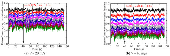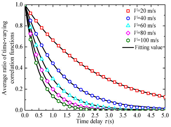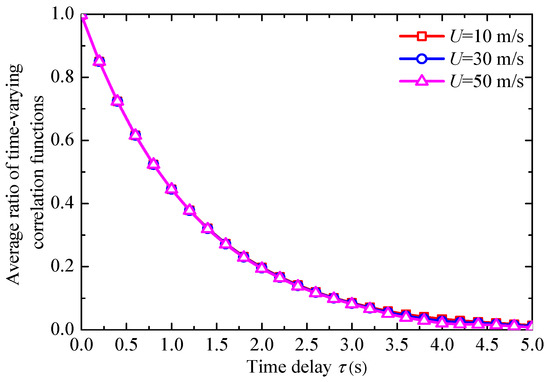 Figure 9 shows the average ratios of time-varying correlation functions of fluctuating wind speed at moving and fixed points under different mean wind speeds, which shows that the average ratio gradually decreases with the increase in time delay τ. More importantly, the average ratios of time-varying correlation functions of fluctuating wind speeds at moving and fixed points are basically coincident under different mean wind speeds, so it can be considered that the ratios do not vary with the change of mean wind speed.