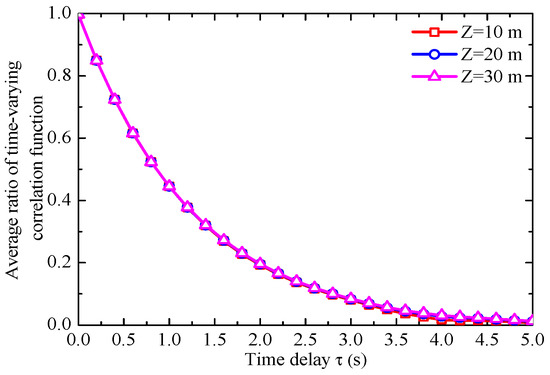 The time–histories of non-stationary fluctuating wind speed at moving and fixed points under the ground clearances of 10 m, 20 m, and 30 m are generated; with the data processed using the same method in Section 3.1, Figure 10 shows the average ratios of time-varying correlation functions of fluctuating wind speed at moving and fixed points under different ground clearances, which also indicates that the average ratio gradually decreases with the increase in time delay τ. More importantly, the average ratios of time-varying correlation functions of fluctuating wind speed at moving and fixed points are basically coincident under different ground clearances, so it can be considered that the ratios do not vary with the change of ground clearances.