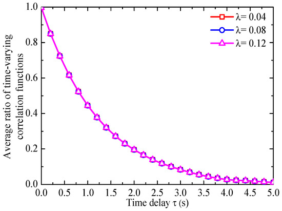 As shown in Equation (11), the temporal modulation function A is a parameter related to λ and β. In order to compare the effects of different temporal modulation function parameters on the time-varying correlation function of fluctuating wind speed at the moving point, the time–histories of non-stationary fluctuating wind speed at the moving point under β = 4 while λ is 0.04, 0.08, 0.12, respectively, and λ = 0.08 while β is 2, 4, and 6, respectively, are generated, with those at fixed points generated as well, while other parameters are set as the same as those in Section 2.2. Figure 11 presents the average ratios between the two under different temporal modulation function parameters λ. It can be seen that the average ratios under different temporal modulation function parameters λ are basically consistent. Therefore, it can be considered that the time-varying correlation function ratio remains unchanged with the change of the temporal modulation function parameter λ.