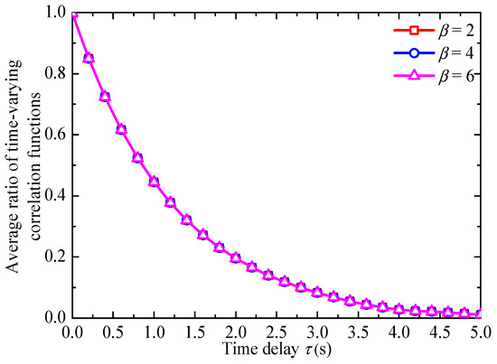 Average ratio of time-varying correlation functions of fluctuating wind speed at moving and fixed points under different temporal modulation function parameter β.