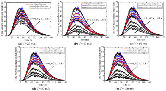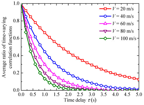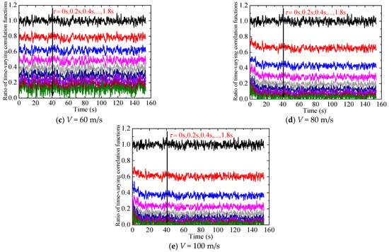 According to the parameters in Section 2.2, the vehicle’s moving speed V = Δy/Δt = 40 m/s. In order to compare the effects of different vehicle’s moving speeds V on the time-varying correlation functions of fluctuating wind speed at the moving point, the time–history curves of fluctuating wind speed at moving and fixed points under the moving speed V of 20 m/s, 40 m/s, 60 m/s, 80 m/s, and 100 m/s are generated. Figure 13 shows the time-varying correlation functions of fluctuating wind speed at the moving point under different vehicle’s moving speeds. It indicates that the time-varying correlation function values of fluctuating wind speed at moving and fixed points are roughly consistent at the time delay τ = 0 s. However, the time-varying correlation function values of fluctuating wind speed at the moving point are smaller than those at fixed points at each time under the time delay τ > 0 s. Similarly, Figure 14 provides the ratios of time-varying correlation functions between the moving and fixed points at different vehicle’s moving speeds, which shows that the ratios fluctuate up and down along a line over time. However, different from previous sections, the ratios are different at different moving speeds V. Figure 15 shows the average ratios of time-varying correlation functions of fluctuating wind speed at moving and fixed points under different vehicle’s moving speeds V. It is seen that the average ratio between the two gradually decreases with the increase in time delay τ, and the average ratio under the same time delay τ gradually decreases with the increase in vehicle’s moving speed. In a word, the above analysis on the effects of different mean wind speeds, ground clearances, temporal modulation function parameters, and vehicle’s moving speeds on the time-varying correlation function ratios of the time history of fluctuating wind speed at fixed and moving points demonstrate that the ratio of the two is insensitive to mean wind speeds, ground clearances, temporal modulation function parameters, but more sensitive to different vehicle’s moving speeds.