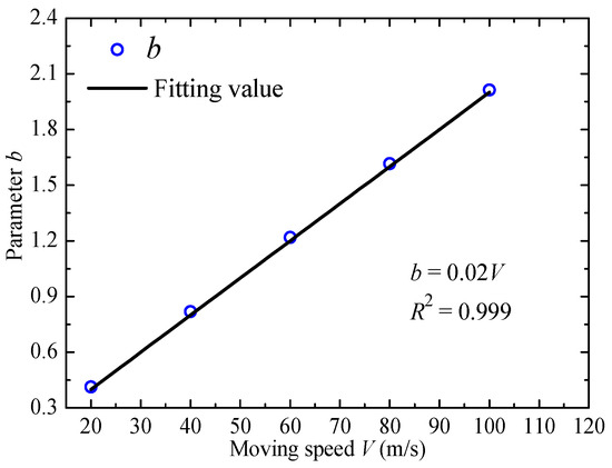 According to the analysis above, few differences in the time-varying correlation function ratios of the time history of fluctuating wind speed at fixed and moving points are caused by different mean wind speeds, ground clearances, and temporal modulation function parameters, but the ratios are sensitive to different vehicle’s moving speeds. Therefore, it can be concluded that the ratio of the time-varying correlation function of the two is only correlated to the vehicle’s moving speed but uncorrelated to the mean wind speed, ground clearance, and temporal modulation function parameters. Subsequently, a quantitative analysis of the time-varying correlation function of fluctuating wind speed at moving and fixed points is carried out in light of Figure 15. The fitting results of the average ratio of time-varying correlation function between the two under different vehicles’ moving speeds V using the exponential function exp(−bτ) is provided in Figure 16. As indicated in Figure 16, high fitting accuracy is achieved using the exponential function, with the goodness-of-fit parameter R2 [36] above 0.999. The changes of parameter b in the exponential function with moving speed V are shown in Figure 17, which reveals that parameter b is basically proportional to the moving speed V, and its relational expression is obtained using linear function fitting as b = 0.02V. Accordingly, the time-varying correlation function of fluctuating wind speed at the moving point RM(τ, t) and that at fixed points R(τ, t) conform to: