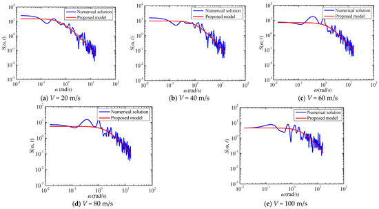 For the purpose of verifying the correctness of the above-proposed model in calculating the fluctuating wind speed spectra at the moving point under the non-stationary wind field, the numerical solutions of the spectra under the moving speeds of 20 m/s, 40 m/s, 60 m/s, 80 m/s, and 100 m/s are compared with the corresponding calculated values obtained using the proposed model (Equations (22)–(26)), as shown in Figure 18. In regard to the numerical solution, the time history of fluctuating wind speed at the moving point under the non-stationary wind field is generated using the direct generation method with the same parameter settings above, and then the fluctuating wind speed spectra of the moving point under the non-stationary wind field is solved numerically using mathematical software Matlab 2016b. As observed in Figure 18, the calculated values at different moving speeds match well with the corresponding numerical solutions, supporting the high calculation accuracy of the proposed model. In conclusion, the fluctuating wind speed spectra model proposed in this paper by Equations (22)–(26) can simulate the fluctuating wind speed at the moving point under the non-stationary wind field.