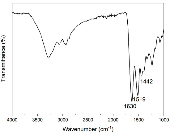 The fish glue product selected is a liquid solution with a water content of approximately 55%, a relative density of 1.17 g/cm3, and a pH value of 6 (Deffner & Johann, Röthlein, Germany) [23]. Figure 1 shows the transmission ATR-FTIR spectra of pure protein fish glue, recorded with a Spectrum 100 spectrometer (PerkinElmer, Shelton, CT, USA). The sample was averaged based on 16 scans in the spectral range from 4000 cm−1 to 500 cm−1 with a resolution of 4 cm−1. The 32-bit software OPUS 8.1 (BrukerOptik GmbH) was used to analyze the obtained spectra. The typical absorption band in the range of 3400–3200 cm–1 for the amino group is a characteristic stretching vibration of the N–H band. The band at 2942 cm−1 is due to the characteristic C–H stretching and can be attributed to the organic binder. The fingerprints of the proteins are clearly seen from the characteristic absorption peaks: amide I C=O stretching vibration at 1630 cm−1; amide II C–N stretching vibration and N-H bending vibration at 1519 cm−1; and amide III C–H bending vibration at 1442 cm−1 [24].