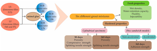 The selected binder/filler ratio was 0.28 by mass. This decision was made in accordance with previous data [1]. Six different grout mixtures were prepared (Table 4), which were divided into two groups (Figure 2). In both groups, a reference grout mixture (LS and LF) was prepared without organic additives. The main difference between the two groups is the type of filler. In the first group (LS, LS-G1, and LS-G2), only the F15 limestone filler was used according to previous studies [1]. In contrast, in the second group (LS-F, LS-F-G1, and LS-F-G2), the fillers F40 and F5 were mixed in a ratio of 70:30. The proposed ratio of the F40 and F5 fillers was chosen based on preliminary studies where the stability and injectability of the grout were the parameters studied.
