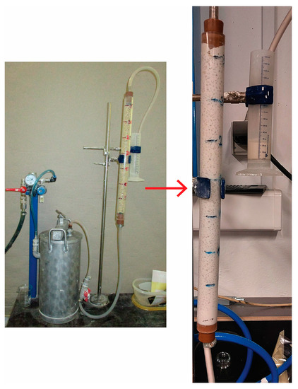 The injectability test was performed based on the standard procedure EN 1771 [28] (Figure 3). Dry siliceous sand with a grain size between 2 and 4 mm was used as the granular material, simulating around a 0.3–0.6 mm large crack or void width.