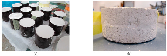 Two sets of samples were prepared to evaluate the hardened properties (Figure 2 and Figure 4): (I) For the mechanical and physical tests, cylindrical molds of 50/50 mm size were made to cast at least three specimens for each property and age. After 48 h, they were removed from the molds and cured under controlled environmental conditions (RH 55 ± 5% and 20 ± 1 °C) for 90 and 365 days. The mechanical and physical properties of the grouts were determined at the age of 90 days, and the splitting tensile strength and porosity were measured again after 365 days.