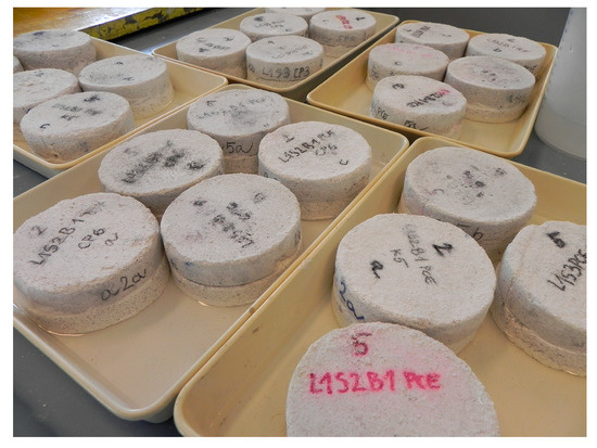 To analyze the durability of the grouts, accelerated aging was performed on the injected disc-sandwich models. The models were subjected to ten freezing–thawing and heating–cooling cycles, according to the protocol in [1]. Prior to each cycle, the discs were subjected to capillary absorption of 3% NaCl solution for 30 min (Figure 5), according to the RILEM test No. II.6 [34].