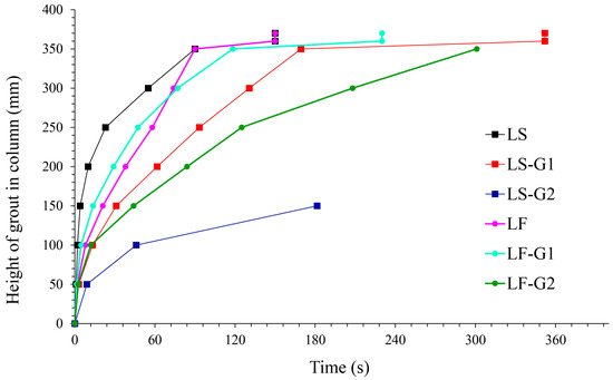 The injectability curve of the tested grouts is shown in Figure 6 for dry siliceous sand columns. According to the results, the reference grouts LS and LF reached 350 mm in 150 s and also filled an additional 20 mL graduated cylinder, which is considered excess grout and is marked in the graph as an additional data point at 370 mm [6]. Comparing the injectability curves of grouts LS and LF, it can be seen that grout LF with the combination of two fillers (F40 and F5) reduces the injectability in the initial phase by up to 350 mm compared to the reference grout LS.
