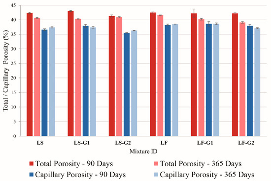 The total and capillary porosity of 90-day-old grout samples and the porosity of the same samples after 365 days are shown in Figure 7. The total porosity of all grouts at the age of 90 days is in a narrow range between 41.1 and 43.0%, despite the different B/W ratios, different fillers, and added organic additive. The combination of different fillers in the grouts has no significant effect on the total and capillary porosity. Grouts LF, LF-G1, and LF-G2 with the combination of two fillers have a total porosity of 42.0% and a capillary porosity of 38.0%. The lowest values of total porosity and capillary porosity were obtained for grout LS-G2 with a lower W/B ratio (41.1 and 35.5%, respectively).