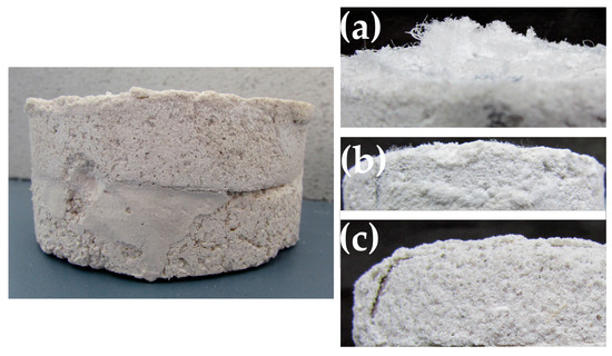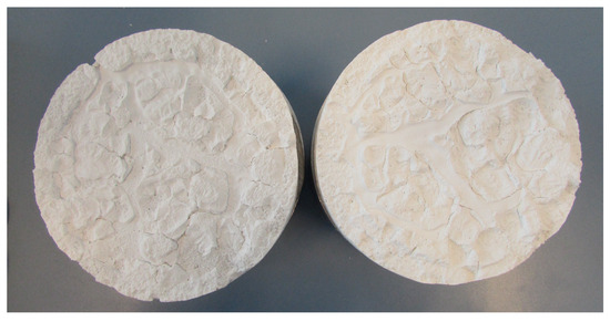 After 10 cycles of freezing–thawing and heating–cooling of the injected disc-sandwich system, dusting, swelling, scaling, and the formation of cracks appeared on the surface of the fine plaster (Figure 9). We can conclude that the tested grouts are a very durable solution that can consolidate detached decorative plasters when salts are present in the wall. The high durability of the grouts can also be attributed to the high total and capillary porosity (Figure 7) and the presence of air bubbles in the grout matrix.