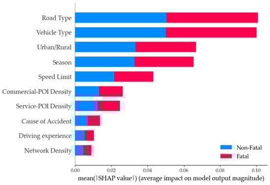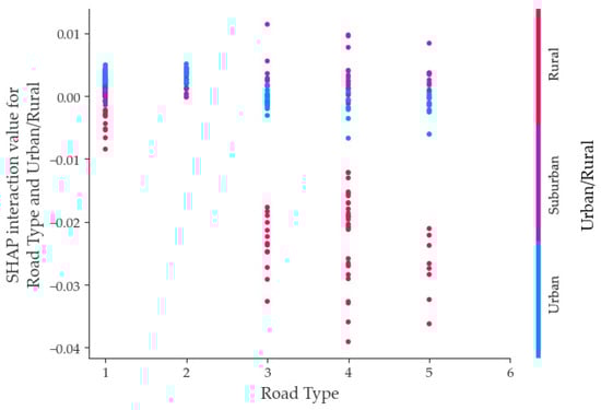 - For urban/rural areas, the two colors of its feature values correspond to urban (blue) and rural (red). The areas where the SHAP values are less than zero are mainly blue points, indicating a negative effect on the severity of accidents, i.e., the possibility of minor accidents is greater when accidents occur in urban districts. The areas where the SHAP values are greater than zero are mainly red points, indicating a positive effect on the severity of accidents, i.e., accidents in rural districts are usually more severe [43]. The positive effect of suburban areas on fatal accidents is much more significant than that of urban areas, which is similar to the principle mentioned above, precisely because of the developed road network in cities and towns. Meanwhile, suburban areas are primarily national or provincial roads, so drivers are less alert, thus having a positive effect on fatal accidents, which is corroborated by the result that lower road network density has a more positive impact.