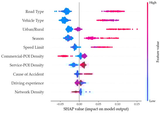 As shown in Figure 3, road type and vehicle type significantly impact the severity of accidents, followed by urban/rural, season, speed limit, catering and commercial POIs density, life services POIs density, accident reason, driving experience, and road network density. To determine the direction of feature importance, local interpretation is performed.