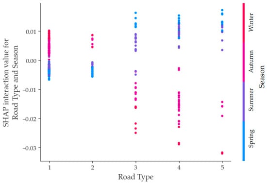 Figure 5 shows that the importance of the characteristic variables changes when the road type interacts with the season. High-rated roads are more likely to produce non-fatal crashes in winter, while high-rated roads are more likely to have fatal crashes in spring and summer. The potential impact of crashes is considered in subsequent studies. Main roads and other types of roads, which may be paved with dirt or concrete, are more likely to be icy in the winter due to cold and wet conditions, and poorer road conditions can create other situations that can lead to hazards or the high-risk nature of the environment.