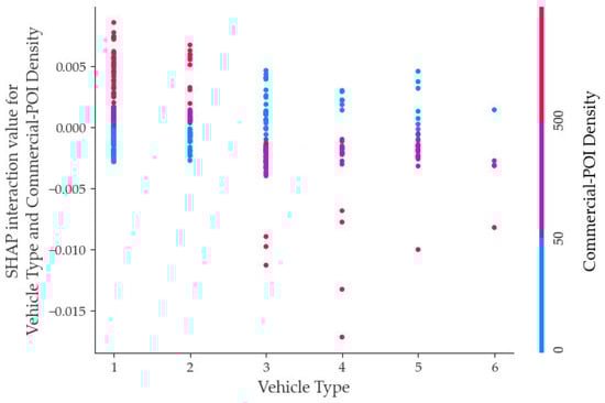 In the results of the interaction between Commercial-POI density and Service-POI density and vehicle type, it is easy to find that the supervision of non-motorized vehicles and motorcycles should be strengthened to reduce the accident rate. In the study by Wang et al. [47], the factors influencing the occurrence of accidents on e-bikes in China were pointed out, and in the study by Outay et al. [48] it was also pointed out that motorcycle accidents are more serious during peak hours, which may be related to severe braking or acceleration events. In a study by Zhu et al. [49] it was found that people with the same socio-economic background were more likely to be involved in accidents between bicycles and other vehicles.