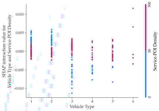 - For Service-POI density, as its feature value increases, it has a positive effect on the severity of accidents, indicating that when the density of the POI is high, the severity of accidents tends to be higher. This result was consistent with previous studies’ results [38]. As its feature value decreases, it has a negative effect on the severity of accidents, indicating that when the density of the Service-POI density is low, the severity of accidents tends to be lower.