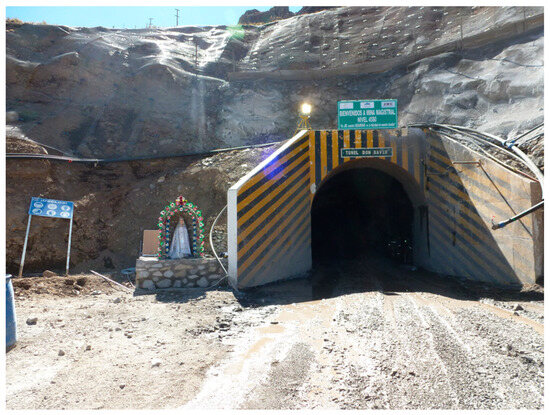In Peru, a promising and increasingly popular alternative strategy to surface management of mine tailings is their disposal as hydraulic fills (HF), cemented hydraulic fills (CHF), and cemented paste backfill (CPB) within underground mines. In Peru, there are historical records that detail the beginnings of the application of hydraulic filling in an underground mine in 1937 in the Cerro de Pasco mine. Since that date, the underground mine backfill technique with mine tailings has evolved and gained much experience considering the site-specific local conditions typical of the Andean region of Peru. Many underground mines around the world use different backfill technologies such as rockfill [22], hydraulic fill [23], and paste backfill [24]. It was the presence of mine tailings near the underground mines and their danger to the environment that contributed to the development of backfilling technologies in the underground mines of Peru. Figure 1 shows typical adit access to an underground mine in the Andean region of Peru.