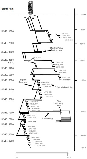 Another aspect to consider for the entry of the mining tailings to be considered as an underground mine fill is the hydraulic transport in pipes, which can be carried out in some cases by gravity or by pumping [48]. This aspect will depend on the geometric configuration of the underground mine levels, taking into account whether the elevations in the masl of the underground mine exploitation levels will be below or above the elevation of the mine tailings backfill production plant for the underground mine [49].