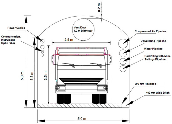 The entrance of the mine tailings to the underground mine is through pipes and must be made compatible with a series of activities that involve: (i) hauling and transporting ore with scoop machinery and mining trucks, (ii) energy conduction facilities with electricity for lighting services inside the underground mine, (iii) ventilation systems, (iv) compressed air intake facilities, (v) groundwater drainage pipes, (vi) fresh water intake pipes and (vii) fiber optic communications systems. Figure 3 shows a typical cross section of an underground mine horizontal tunnel implemented in mining operations in Peru: