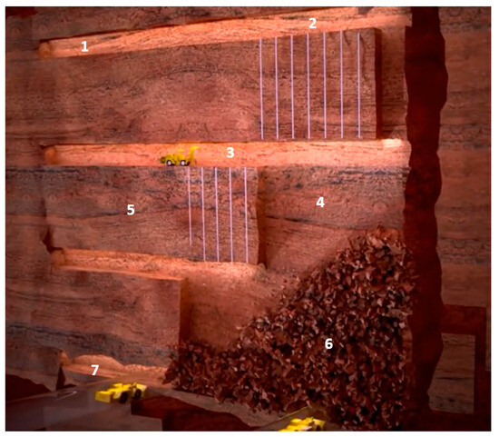 Typical underground mine exploitation method applied in Peru. (1) Sublevel drift, (2) Drilling, (3) Drilling and blasting, (4) Stope, (5) Solid ore, (6) Blasted ore, (7) Loading crosscut.