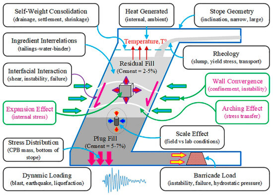 The filling of underground mine stopes with mine tailings requires an adequate design and rigorous operation [52]. The filling must occur under controlled safety conditions to avoid failures or accidents inside the underground mine [53]. Some of the aspects that must be considered are the following: (i) Geometry of the stope, (ii) Heat generation, (iii) Consolidation by own weight, (iv) Interaction of chemical components of the mine tailings, (v) Rheology of mine tailings, (vi) Interfacial interaction, (vii) Stability conditions of the stope walls, (viii) Stress distribution, (ix) Behavior of dynamic loads, (x) Loads in plugs or barricades, in accordance with what is indicated in Figure 7.
