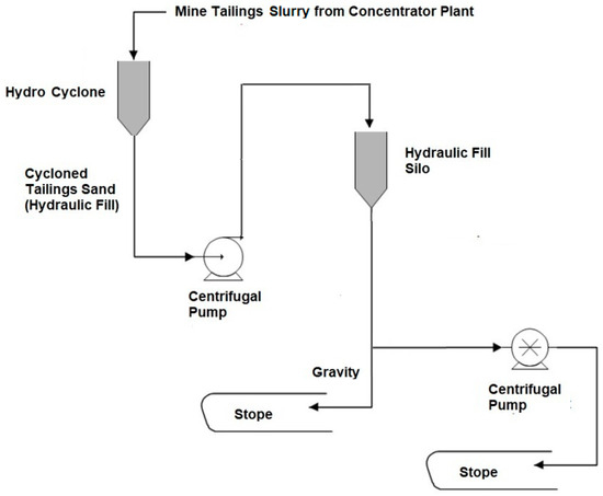The hydraulic fill, as with any method of filling, has two main purposes in the underground mining operations carried out in Peru: (i) the first is to serve as a working floor to carry out the drilling, blasting, and hauling of ore operations, and (ii) the second is to serve as support so that the underground mine does not collapse due to the increase in open areas. Figure 9 shows a typical flow diagram of the underground mine hydraulic fill production and transportation process applied in Peru: