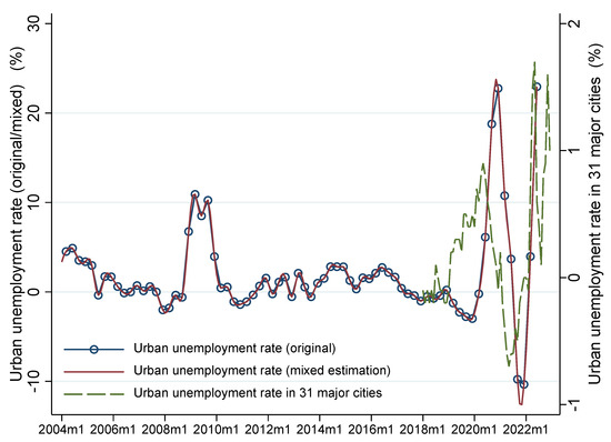 This paper chooses the year-on-year change rate of urban unemployment from the first quarter of 2004 to the second quarter of 2022 (hereinafter referred to as the urban unemployment rate or unemployment rate) and the period from January 2004 to June 2022 to measure the relationship between employment and industry dynamics over a longer period. The industry’s volatility data are a mixed frequency sample data set that includes monthly and quarterly data. The quarterly urban unemployment rate data in this paper comes from the database on the website of the National Bureau of Statistics of China (https://data.stats.gov.cn/, accessed on 5 February 2022), which is the employment data sample with the longest time horizon to date, and the stock return data required for calculating sectoral fluctuations comes from China Stock Market & Accounting Research Database (https://cn.gtadata.com/, accessed on 5 February 2022). Schorfheide and Song (2015) [40] recommended that we treat the unobservable monthly urban unemployment rate as a state variable, build a state space equation, and estimate the urban unemployment rate at the monthly level using the Bayesian approach. For 31 large cities, the National Bureau of Statistics also provides monthly urban unemployment rate survey statistics, but the data are relatively recent (the records only go back to 2018). The graph of the urban unemployment rate in 31 major cities is shown in Figure 1 below, along with the original and mixed-frequency estimated urban unemployment rates. We can see that the three measures’ fundamental trends are consistent, particularly following COVID-19’s impact in January 2020, when the three unemployment variables all revealed the same ups and downs.