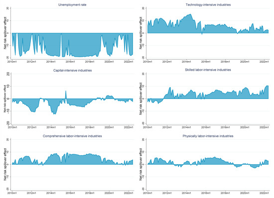 Using the risk spillover net effect index, we evaluate the risk output and input direction of variables. Therefore, in the next portions of this paper’s study, we use the risk spillover net effect index to look at how industry variations are translated into high employment risks.