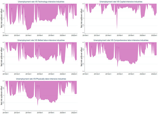 Figure 2 does not identify the specific industries at risk; it just depicts the detrimental impact of employment on the risk of external shocks to all industries. We rolled evaluated the dynamic risk spillover impact between pairings in accordance with Equation (8) to precisely grasp the risk transmission effect of industrial categories on the unemployment rate. The results are shown in Figure 3 below.