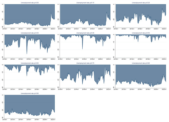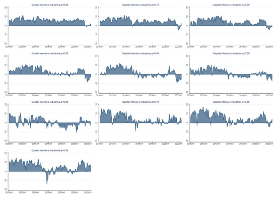 We first look at the overall distribution of employment and industry volatility’s net risk spillover effect or how all external risks, as determined by the Equation (7), affect the quantiles of employment and industry volatility. The net impact of distributional risk spillovers is assessed using the same parameters as the mean risk spillover model in Section 5. The net impact of distributional risk spillovers is calculated on a rolling basis for each month using the same settings as the mean risk spillover model in Section 4. The quantile (q) in Figure 4 below indicates the net risk spillover effect of external risk shocks on the unemployment rate distribution. When the employment level is in an extremely good state (the unemployment rate quantile is in the range of 0.05–0.15) or when the employment level is in an extremely bad state (the unemployment rate quantile is in the range of 0.85–0.95), which is when external risk shocks are most deeply felt, we can see that the employment group has always been a risk bearer. The influence of external threats is minimal when the employment level is in a normal state, i.e., when the quantile of the unemployment rate lies between the two extreme ranges. External shocks have the least impact when the unemployment rate is at its 0.55 quantile. Quantitatively, compared to the mean-based risk spillover impact (13.33%), the average risk spillover effect on the unemployment rate in the extreme range is 24.17%. The average risk spillover impact that is experienced under typical conditions is 9.11%, which is less than the risk spillover effect calculated using the average value. The severe risk is 2.65 times greater than the average risk, which has significant economic implications. Additionally, we can see that the external extreme risk spillover effect of the unemployment rate before the COVID-19 (2010–2019) is distributed evenly across each year, showing that China’s labor market has a relatively high-risk exposure and is susceptible to external risk shocks during the sample period (2019–2022). After the outbreak of COVID-19 (2020–2022), the spillover effect of external extreme risks to the unemployment rate has weakened, which may be due to three reasons: first, the lockdown and social distancing policies adopted to prevent the spread of COVID-19 may weaken the effective transmission channels of unemployment in other sectors; second, the hedging policies adopted by the Chinese government to withstand the impact of the epidemic have mitigated the negative effects of industry shocks on employment to a certain extent; third, some industries (such as healthcare and consumer goods) experienced significant increases in demand during the pandemic, which offset the unemployment effects in other sectors.