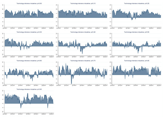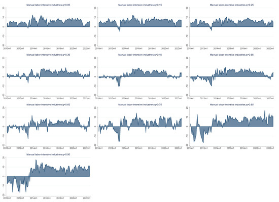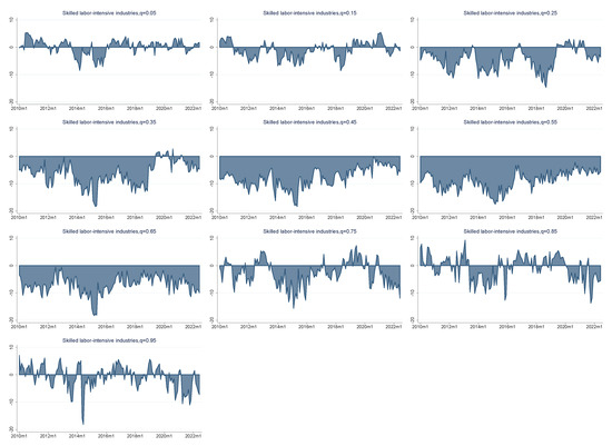 The net spillover effect of volatility distribution in capital- and technology-intensive businesses from 2010 to 2022 is depicted in Figure 5 below. Most of the time, capital- and technology-intensive industries are risk-outputting sectors and only sometimes engage in risk-taking. The volatility risk spillovers of the two main industry sectors both display an extreme value distribution pattern, which is similar to the pattern shown in Figure 4. The net effect of risk spillover over time is greatest at the lowest and highest quantiles, but it is very small in the medium quantile range. The extreme spillover effect is 1.9 times greater than the general spillover effect and has significant economic implications for technology-intensive industries, with net spillover effects in the two extreme quantile ranges of 0.05–0.15 and 0.85–0.95 being, on average, about 5.76% and 3%, respectively. The extreme spillover effect for capital-intensive businesses is twice as great as the general spillover effect, and its economic impact is also significant. In relative terms, the extreme spillover effects of capital-intensive industries are weaker than those of technology-intensive industries, which indicates that the direct and indirect employment-absorbing effects of capital-intensive industries are weaker than those of technology-intensive industries. From the perspective of the time-series change in the risk spillover effect of extreme cases, the change in the risk spillover effect of technology-intensive industries is relatively stable, whereas the risk spillover effect of capital-intensive industries changes more in extreme bad scenarios, reflecting the stronger economic cycle sensitivity of capital-intensive industries. There are evident disparities in the distribution spillover effects of the subdivision industry categories, as shown in Figure 6, Figure 7 and Figure 8 below, which indicate the net effect of fluctuation distribution spillovers of the three labor subdivision industries. Figure 6 shows that risk acceptance is typically dominant in skilled labor-intensive businesses. Combining the data in Figure 9, Figure 10 and Figure 11, we can conclude that the risk input for skilled labor-intensive industries that require a high level of labor is caused by fluctuations in other industries rather than spillovers from the risk of unemployment. Figure 6 further demonstrates that industries that depend heavily on skilled labor are less influenced by extreme events than they are by general ones, demonstrating that the risk of extreme employment for skilled labor is relatively low and that they belong to a stable employment group. Comprehensive and manual labor-intensive industries are primarily based on risk output, and, as the level of labor skills declines, the depth to which their risk spillover effects are affected by extreme events is deeper. This finding suggests that low-skilled physical strength labor-intensive industries are more vulnerable, and, as the level of labor skills declines, the extreme risk of employment of workers rises. The above analyses are consistent with the theoretical logic and testable research hypotheses of this paper.