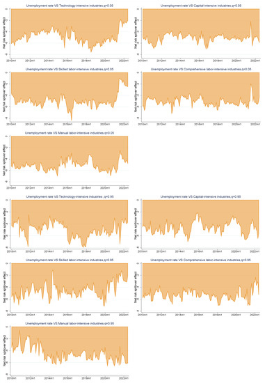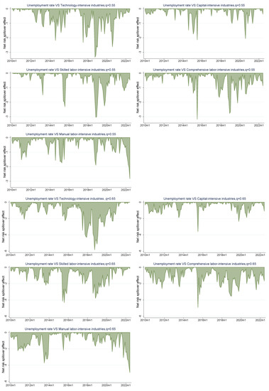 This section especially looks at the Equation (8)-derived pairwise distribution transmission relationship between employment fluctuations and industry variations. The net impact of risk spillovers at employment and industry volatility quantiles of 0.05 and 0.95 is depicted in Figure 9 below, where quantile 0.05 denotes an extremely unfavorable scenario, and quantile 0.95 denotes an extraordinarily favorable situation. We may observe that changes in five industries have a large impact on employment in severe circumstances. The average net effect of individual industry risk spillovers is roughly 4.9%, with a high of 8.4%. The risk spillover impact based on the average, in comparison, is only 0.6% on average, demonstrating that it is unable to accurately reflect the employment risk. Figure 9 demonstrates that the distribution of the extreme risk of the unemployment rate is symmetrical, i.e., the influence of industry variations on unemployment rate risk transmission is essentially the same in both extremely favorable and extremely bad circumstances. At the same time, we can also discover that capital-intensive industries and labor-intensive technology-intensive businesses both, in extreme circumstances, have a substantial risk of transmission to the unemployment rate in contrast to the above findings. From the perspective of time-series changes in extreme risk spillovers, after the outbreak of COVID-19 and among the three labor-intensive industries, the technology-intensive industry has the smallest extreme risk spillover effect on unemployment rate fluctuations, followed by the comprehensive labor-intensive industry, and the manual labor-intensive industry has the largest extreme risk spillover effect on unemployment rate, which is consistent with the research hypothesis of this paper. Autor and Dorn (2013) [38] argue that there is polarization in the labor market, i.e., high-skilled and low-skilled workers have a lower risk of unemployment, whereas medium-skilled workers have a higher risk of unemployment. However, their study does not provide a comparison of the unemployment risk of different skilled workers in extreme cases, whereas the results of this paper show that low-skilled workers have a greater risk of unemployment (in the form of higher extreme unemployment risk spillover effects in manual labor-intensive industries) in extreme bad cases, which is a useful supplement to existing research.