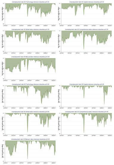 The impacts of industry fluctuations with quantiles between 0.35 and 0.65 on the unemployment rate are depicted in Figure 10 and Figure 11, respectively. Figure 10 and Figure 11 demonstrate that the effects of the five industries’ risk spillover on the unemployment rate are substantially less severe compared to the extreme situation. The average risk spillover net effect is only 1%, and, for quantiles nearer the median, the unemployment rate’s risk is negative. The distributional spillover pattern we discovered in the preceding section is consistent with the lesser spillover. Figure 10 and Figure 11 also demonstrates that, even under normal conditions since the epidemic’s outbreak, the impact of industry risk on the unemployment rate has generally increased, with low-skilled labor-intensive industries having a stronger impact than higher-skilled labor-intensive industries. This finding is similar to the one in the previous section.