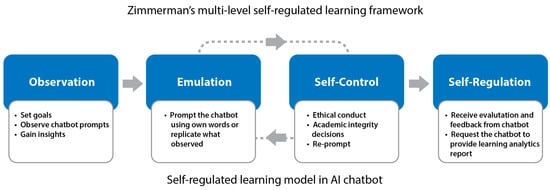 Zimmerman’s multi-level SRL framework [7,8] encompasses four distinct levels: observation, emulation, self-control, and self-regulation (see Figure 1). Each level represents a progressive stage in the development of SRL skills. This framework guides us to explore how a chatbot can facilitate SRL at each stage of Zimmerman’s framework. For example, when students use AI chatbots for their learning, they treat the chatbots as a resource. They enter questions or commands into the AI chatbots, hoping to seek clarifications or information from the chatbots for the task at hand. We assume that this type of utilization of AI chatbots elicits students’ self-regulation. We propose that Zimmerman’s multi-level SRL framework helps to interpret the SRL processes undertaken by students.