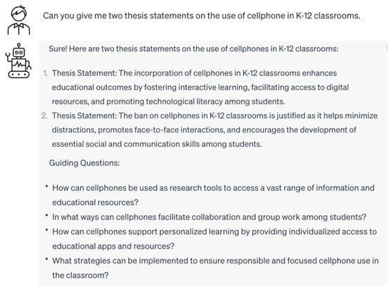 However, so far, we have found that the current AI-powered chatbots, like ChatGPT, have limited capabilities in reverse prompting when used for educational purposes. Reverse prompting functions as guiding questions after students prompt the chatbot. As suggested in the last section, after learners identify their prompts and goals, chatbots can ask learners to reflect on their learning and provide “reverse prompts” for self-assessment. The concept of reverse prompts is similar to reciprocal questioning. Reciprocal questioning is a group-based process in which two students pose their own questions for each other to answer [68]. This method has been used mainly to facilitate the reading process for emergent readers [69,70,71]. For instance, a chatbot could ask a learner an explanatory question like “Now, I give you two thesis statements you requested. Can you provide more examples of the relationship between the two statements of X and Y?” or “Can you provide more details on the requested speech or action?” as well as reflective questions like “How do you generalize this principle to similar cases?” to rate their understanding of a particular concept on a scale from 1 to 5 or to identify areas where they need more practice. We mock an example of such a conversation below in Figure 2.