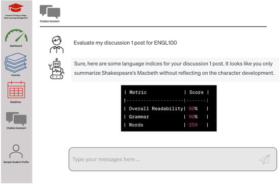 Learner adaptation can be effectively facilitated through the utilization of learning analytics, which serves as a valuable method for collecting learner data and enhancing overall learning outcomes [75]. Chatbots have become more practical and intelligent by improving natural language, data mining, and machine-learning techniques. The chatbot could use the trace data collected on LMS to provide students with the best course of action. Data that the chatbot can collect from the LMS can include analysis of students’ time spent on a page, students’ clicking behaviors, deadlines set by the instructors, or prompts (goals) initiated by the students. For example, a student has not viewed their module assignment pages on a learning management system for a long time, but they request the chatbot to generate a sample essay for their assignments. Instead of giving the direct output of a sample essay, the chatbot can direct the student to view the assignment pages more closely (i.e., “It looks like you haven’t spent enough time on this page, I suggest you review this page before attempting to ask me to give you an essay”), as shown in Figure 3. In this way, learning analytics can also help learners take ownership of their learning by providing real-time feedback on their progress and performance. By giving learners access to their learning analytics, educators can empower students to actively learn and make informed decisions about improving their performance [75,77]. An example is shown in Figure 4. Therefore, through personalized and adaptive chatbot interactions, learners can receive feedback and resources that are tailored to their specific needs and performance, helping to improve their metacognitive skills and ultimately enhancing their overall learning outcomes.