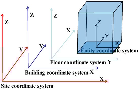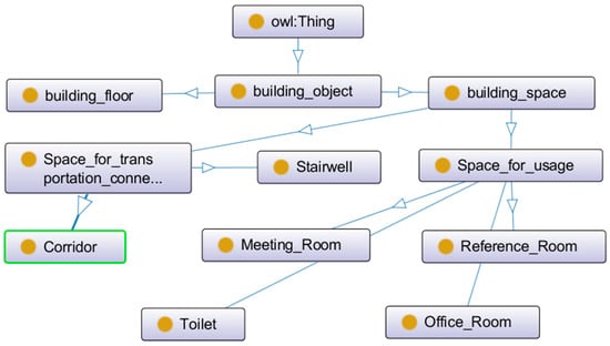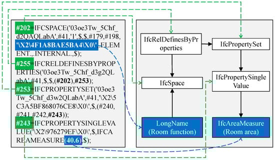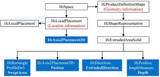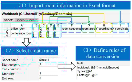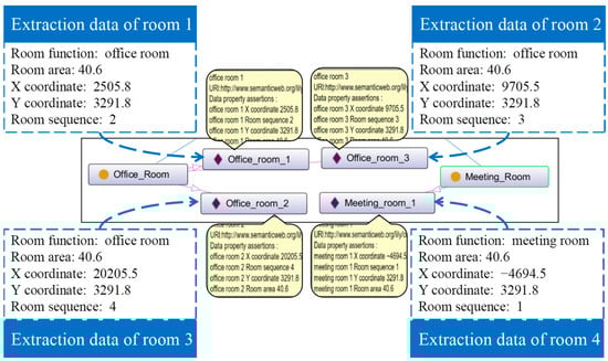 - Data extraction and conversion. The building design BIM model integrates a large amount of design information, and this study is based on BIM to obtain the building plan layout information required for exit location optimization. However, the BIM model cannot be directly parsed by the inference engine, so further data extraction and conversion are needed. This part aims to extract the design data from the BIM model and convert it into ontology instances in RDF format.