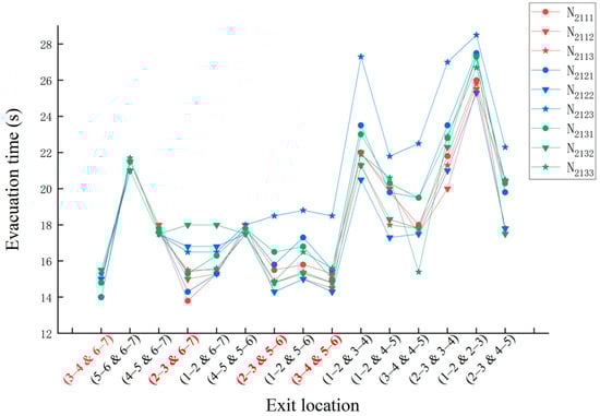 | Exit Location | Evacuation Time (s) | Exit Location | Evacuation Time (s) | The Optimization Strategy Obtained by Inference | Exit Location | Evacuation Time (s) | |