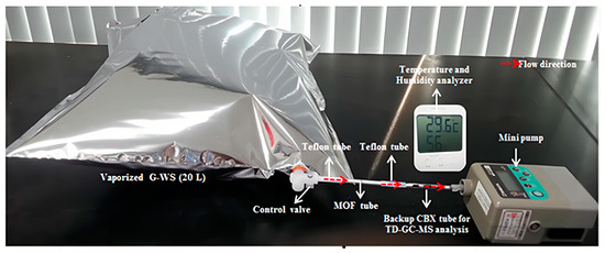 Xiaoling Ma’s team [34] tested the adsorption of MIL-100(Fe) on toluene, and the main adsorption mechanism was found to be the π-π bond formed between the organism and the benzene ring, as shown using X-ray photoelectron spectroscopy analysis. Philippe Trens’ team [70] performed a study using MIL-101(Cr) (Figure 2) adsorption experiments and simulations on n-hexane and benzene vapor and confirmed that the π-π-bond formation contributes to the adsorption of benzene by the material. In the competitive adsorption of hexane and benzene, hexane inhibits π-bond stacking to some extent to reduce the adsorption of benzene. The team of Kowsalya Vellingiri [71] studied the adsorption of 14 volatile or semi-volatile organics by MOF-5, Eu-MOF, and MOF-199, and their DFT simulations showed where π-π bonding is a key factor affecting the adsorption performance. The configuration of the adsorption apparatus is depicted in Figure 3. The team of Chongxiong Duan [72] optimized the synthesis of MIL-100(Fe) to synthesize the MIL-100(Fe)_An series, and they similarly used adsorption density simulations to show that the stacking of π-π bonds plays an important role in the adsorption of toluene. The experiments conducted by Vipin K. Saini’s team [73] clearly showed that MOF-199 adsorbs more benzene than n-hexane and cyclohexane, which is also due to the ease of formation of π-bonds between the metal sites in the material and benzene.