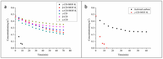 (a) The concentration of formaldehyde changes due to the adsorption of α-CD-MOF-K, β-CD-MOF-K, γ−CD-MOF-K, α-CD, β-CD and γ-CD. (b) Comparison of adsorption properties of activated carbon and γ-CD-MOF-K [74].