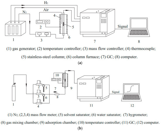(a) The experimental system for temperature-programmed desorption [41]. (b) Breakthrough experiment of benzene and water vapor [41].