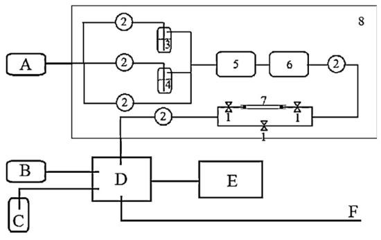 The dynamic adsorption equipment. A: air producer; B: H2 producer; C: N2 storage; D: GC; E: PC; and F: exhaust gas emission. (1): Valve; (2): mass flow meter; (3): liquid VOCs; (4): water; (5): mixing chamber; (6): stable chamber; (7): adsorption tube with MOF-177; (8): chamber with temperature control [42].